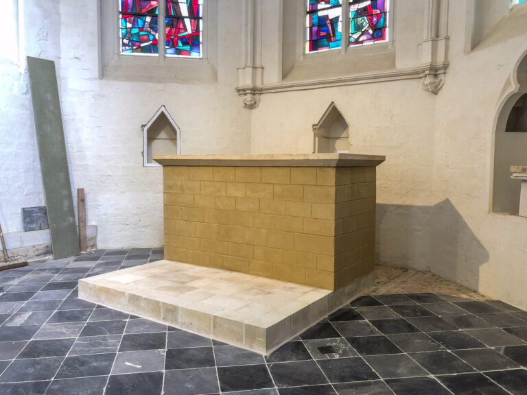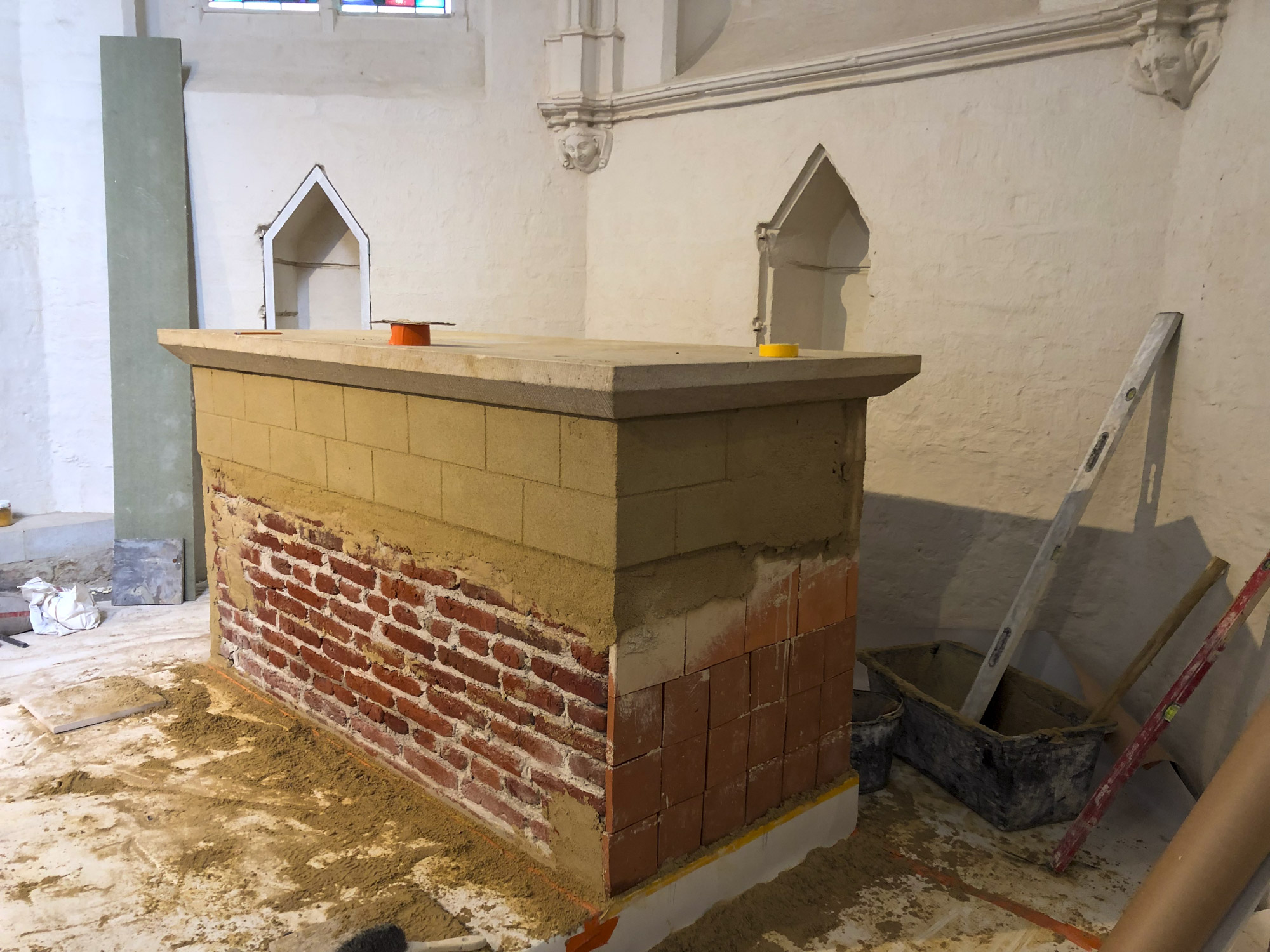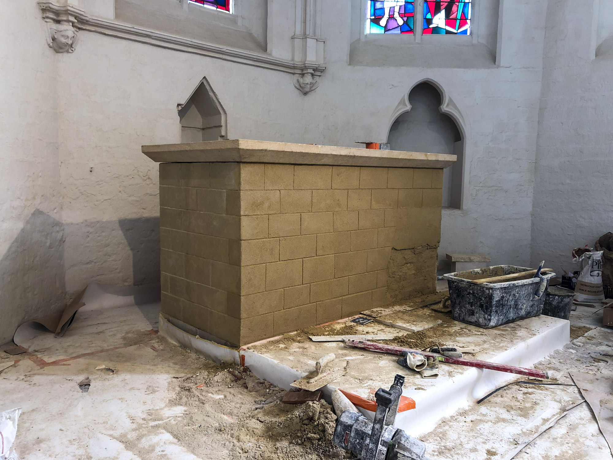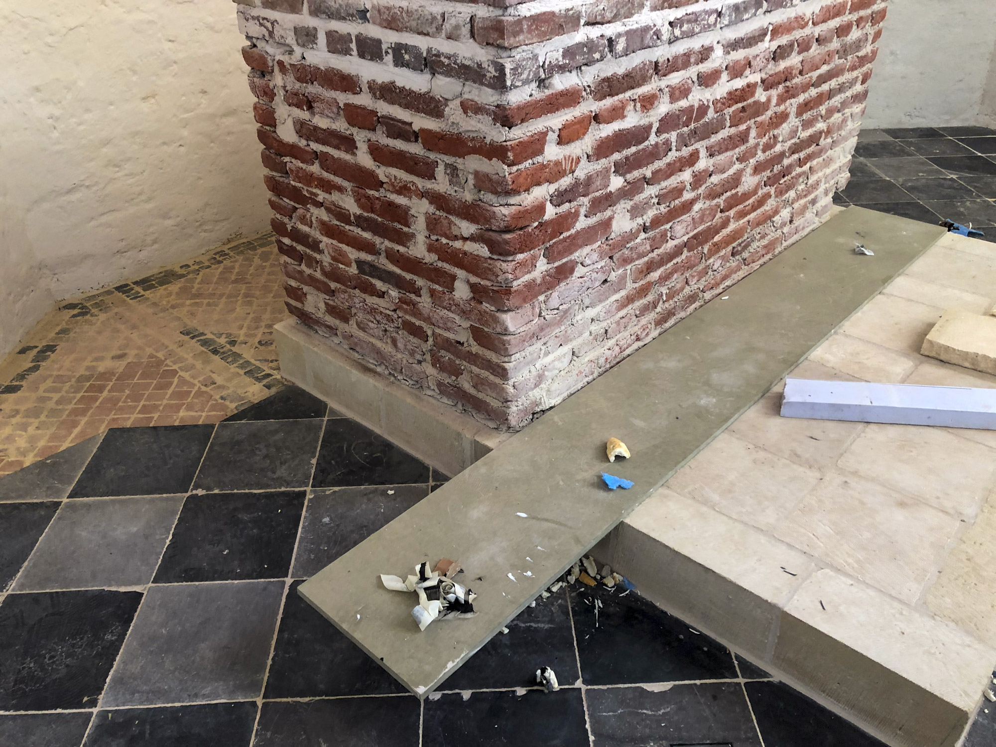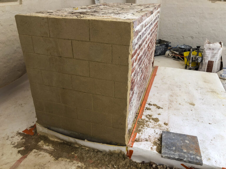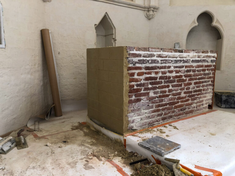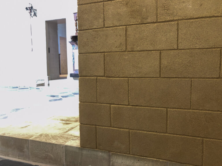 Simili-pierre reconstruisant le décor d’une maçonnerie en pierre de taille. La matière utilisée est un mortier de chaux calibré et teinté sur mesure, afin de pouvoir, au-delà de la teinte, faire apparaitre des textures se rapprochant au mieux d’une surface de pierre naturelle. Travail effectué pour la société Profiel